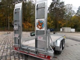 Autotransporter, Autotransportanhänger, Ladefläche 4100 x 2050 mm, Zulässiges Gesamtgewicht 2700 Kg, Zuladung 2070 Kg, Tandemachser gebremst, mit Seilwinde und Auffahrschienen.