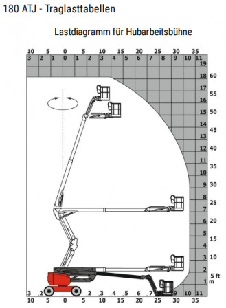 Arbeitsbereich Arbeitshöhe 15,50 m Arbeitsstandhöhe 15,50 m / Knickpunkthöhe 6 m seitl. Reichweite max. 10 m