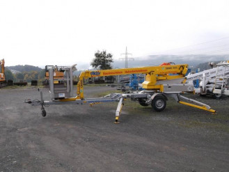 Anhänger-Arbeitsbühnen TA150 Arbeitshöhe max.: 12,50 m   Plattformhöhe max.: 10,50 m   seitl. Reichweite max.: 8,50 m   Größe d. Arbeitskorbes: 1,25 m x 0,80 m x 1,10 m   Tragfähigkeit d. Korbes: 200 kg   Drehbereich: 2 x 355°   Bauhöhe: 1,97 m   Fahrzeuglänge: 7,10 m   Fahrzeugbreite: 1,60 m   Abstützbreite: 3,90 m   Gesamtgewicht: 1700 kg   Ausstattung: ·Batterieantrieb ·zuschaltbarer Rangierfahrantrieb ·drehbarer Arbeitskorb