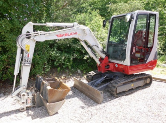 Takeuchi Mini-Raupenbagger TB 230 Gewicht: 2875 kg Leistung: 17,6 kW / 23,9 PS Grabtiefe: 2835 mm Reichweite: 4850 mm Breite: 1460 mm Höhe: 2525 mm