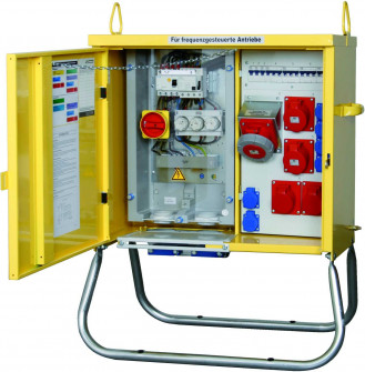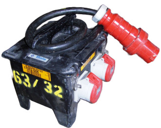 Ausgänge: 1 x CEE-Dose 63 A, 5polig; 2 x CEE-Dosen 32 A, 5polig; 2 x CEE-Dosen 16 A, 5polig; 6 x Schutzkontakt-Steckdosen 16 A