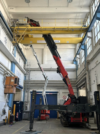 Ladekran Palfinger PCC115.002, Tragkraft max. 17.000 kg, Tragkraft Spitze 950 kg, Arbeitshöhe 32 m, Ausladung 34 m, Tragkraft 17 t "Das Kamel im Nadelöhr"Hochflexibles Arbeitgerät 115mt. Diesel und Elektrisch. Geteilter Transport ohne Genehmigung auf standart LKW. Innerhalb von 48h deutschlandweit verfügbar. Nur mit Bediener. Fahren mit angehängter Last bis 6t. BG zugelassener Fahrmodus zur Personensicherung am Kran, siehe PDF. Verladebar auf DB Plattenwagen. Arbeitskorb bis 34m Höhe und 32m wagerechter Auslage. Mit der Shiftfuktion können Engstellen, oder Tore ab 2,2m x 2,7m passiert werden.