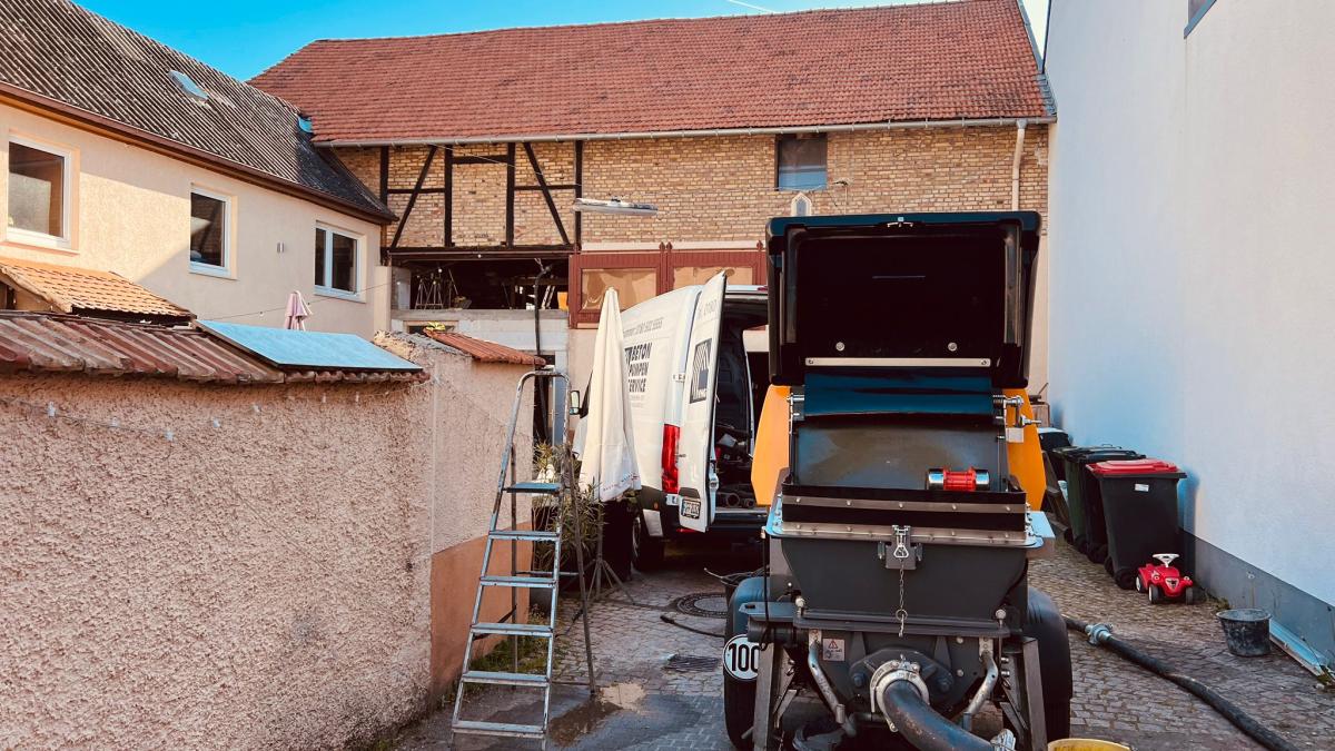2 Der Stellplatz der VHG Betonpumpe wird vom Auftraggeber selbst sichergestellt und festgelegt. Zum Einsatzzeitpunkt ist ausreichend Platz für einen Transporter und einer VHG P720 Pumpe zur Verfügung zu stellen. Der Betontrichter der Pumpe befindet sich auf der Rückseite des Anhängers und muss von dort aus durch das Lieferfahrzeug (Betonmischer) befüllt und angefahren werden.