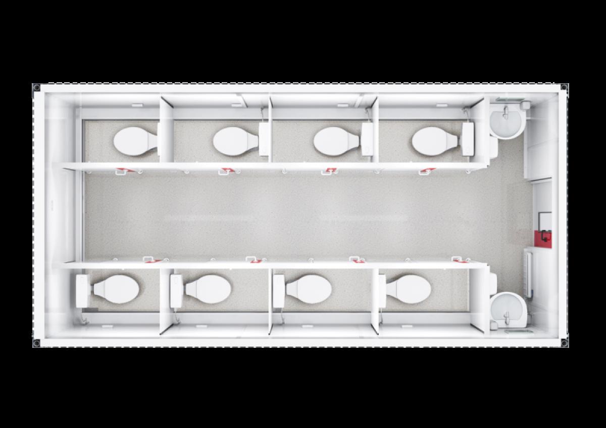 Der Basic Line WC-Container für Damen bietet viel Platz auf kleinem Raum. Insgesamt stehen acht komfortable Toilettenbereiche zur Verfügung. Gerade bei Großveranstaltungen lassen sich so lange Wartezeiten vermeiden.