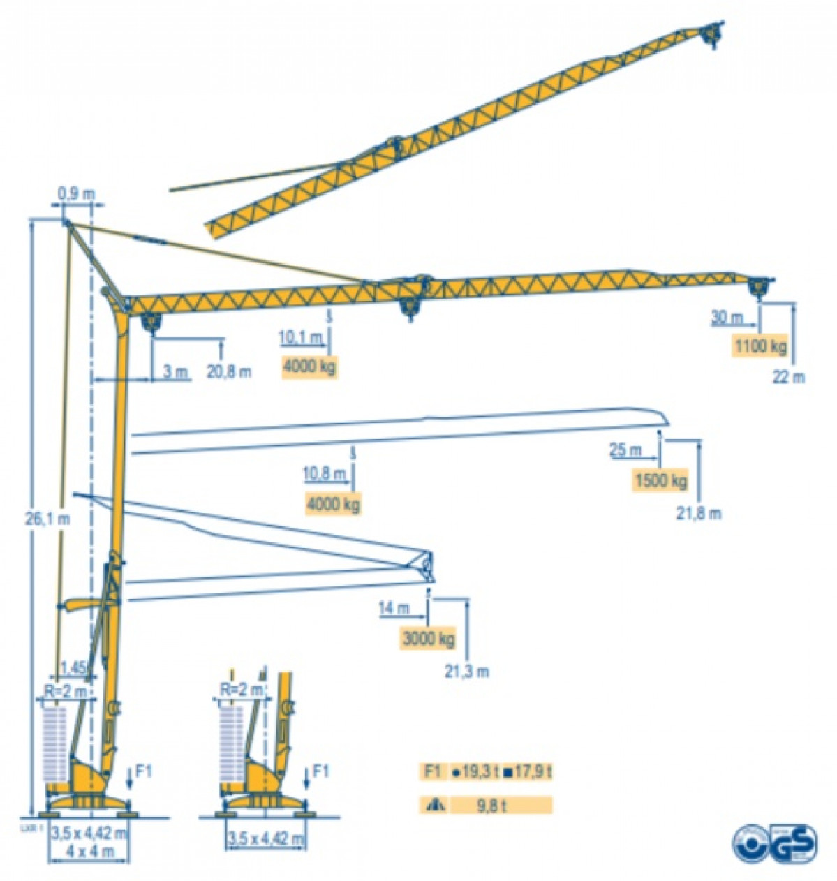 Baukran mieten Ingolstadt Hochbaukran Potain IGO 32, Ausladung 30 m, Tragkraft Spitze 1100 kg.