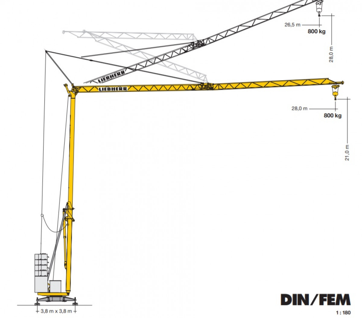 Baukran mieten Ingolstadt Schnelleinsatzkran Liebherr 26 H, Ausladung 28 m, Tragkraft Spitze 800 kg.