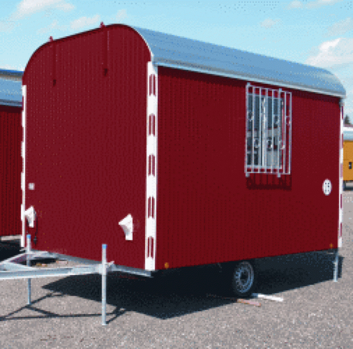 Bauwagen 3,5 m lang Komplett mit Einrichtung für Tagesunterkunft von 6 Mann; Baustellenwagen Einrichtung: 2 Tische, 4 Bänke, 1 Ofenecke, komplette Elektroinstallation, Vorhang als Windfang