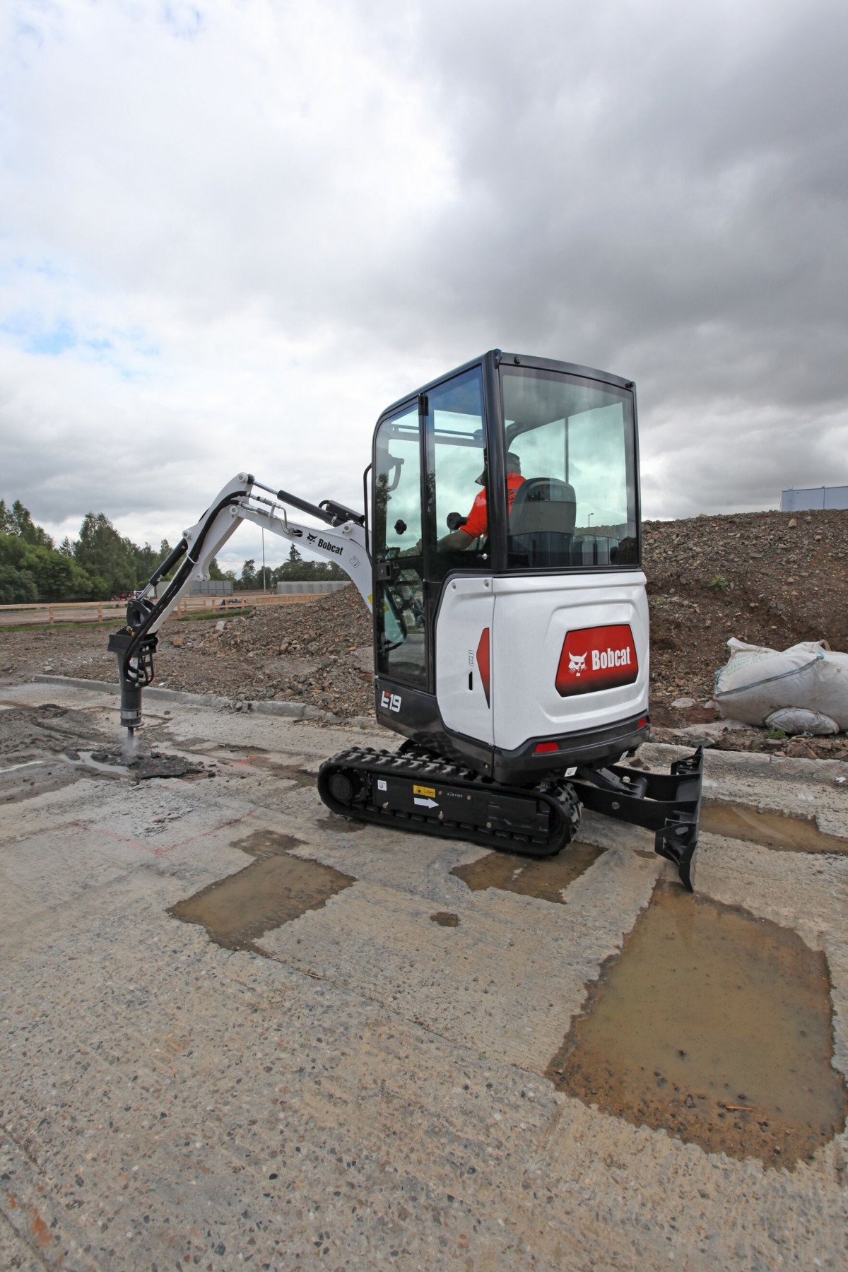 Der Bobcat E19 Kompaktbagger liefert beeindruckende Leistung auf engstem Raum und muss nur minimal neu positioniert werden. Zur Fahrt durch Tore oder zwischen Wänden und Häusern kann der Fahrer das Fahrwerk hydraulisch auf eine Breite von nur 98 cm einfahren und dann für eine stabilere Standfläche und höhere Leistung wieder bis auf 136 cm ausfahren. Der E19 besitzt einen reduzierten Heckschwenkradius, was eine höhere Vielseitigkeit und Wendigkeit auf beengten Baustellen gewährleistet. Der durch Tastendruck schrittweise einstellbare Auslegerversatz (Sonderausrüstung) und die Zusatzhydraulik bietet den doppelten Vorteil besserer Kontrolle der Auslegerschwenkfunktion und angeschlossener Anbaugeräte bei gleichzeitig mehr Fußraum und höherem Komfort für den Fahrer.