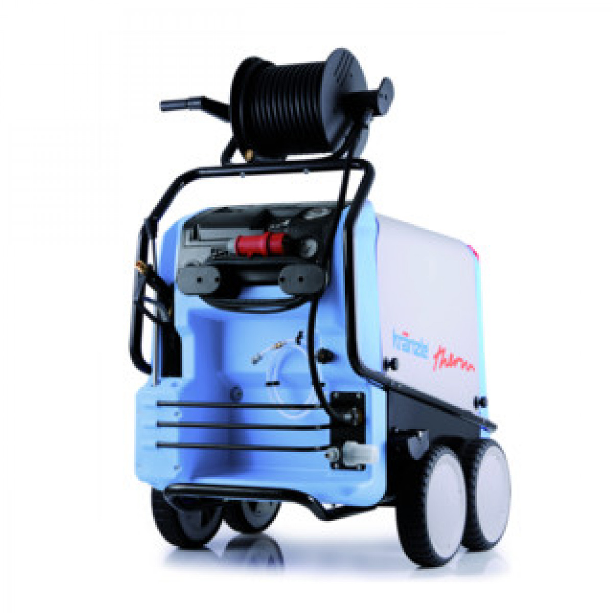 Heißwasser-Hochdruckreiniger mit integriertem Fahrwerk, inkl. 10m Schlauch, 35l Brennstofftank und stufenloser Temperaturregelung.