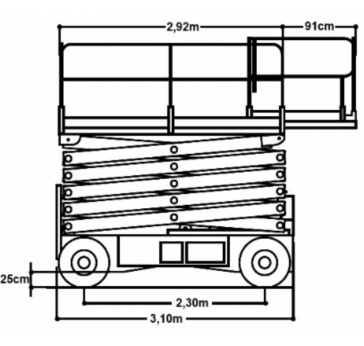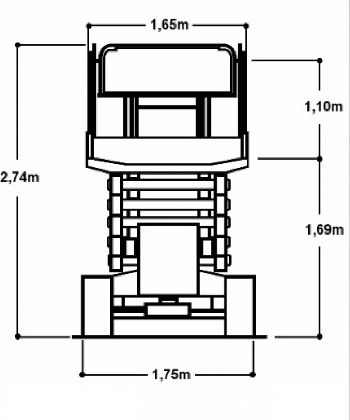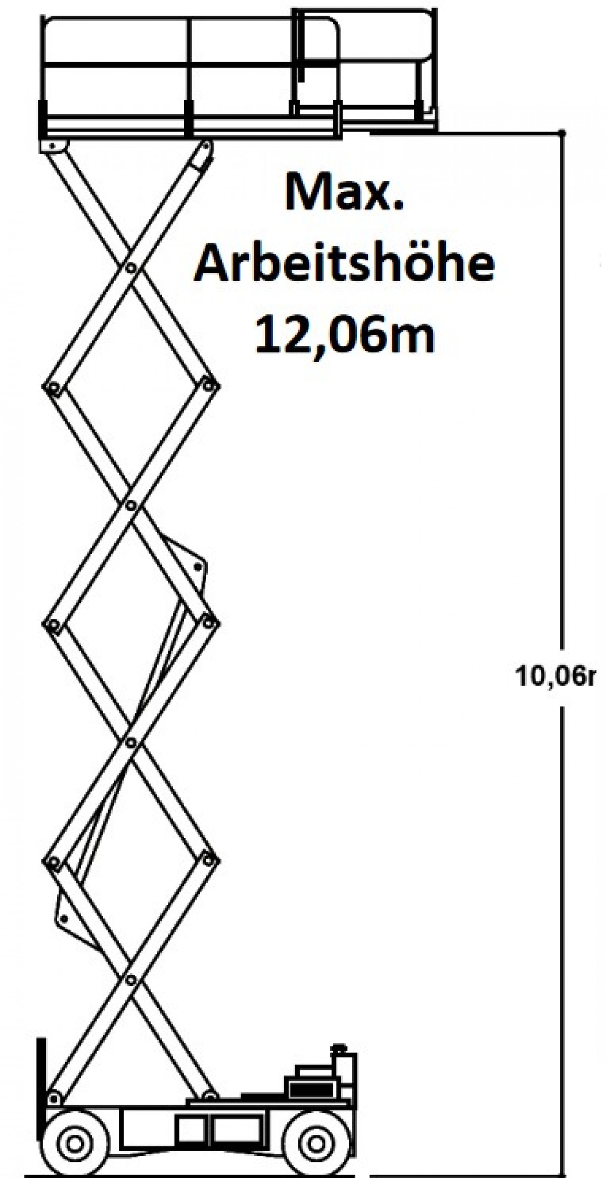 Max. Arbeitshöhe 12,06 m Max. Bodenhöhe 10,06m Plattformlänge -mit Ausschub 2,92m 3,83m Plattformbreite 1,65 m, Höhe mit Geländer - ohne Geländer 2,74m