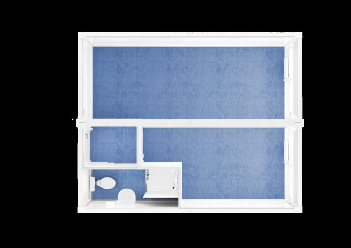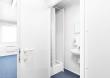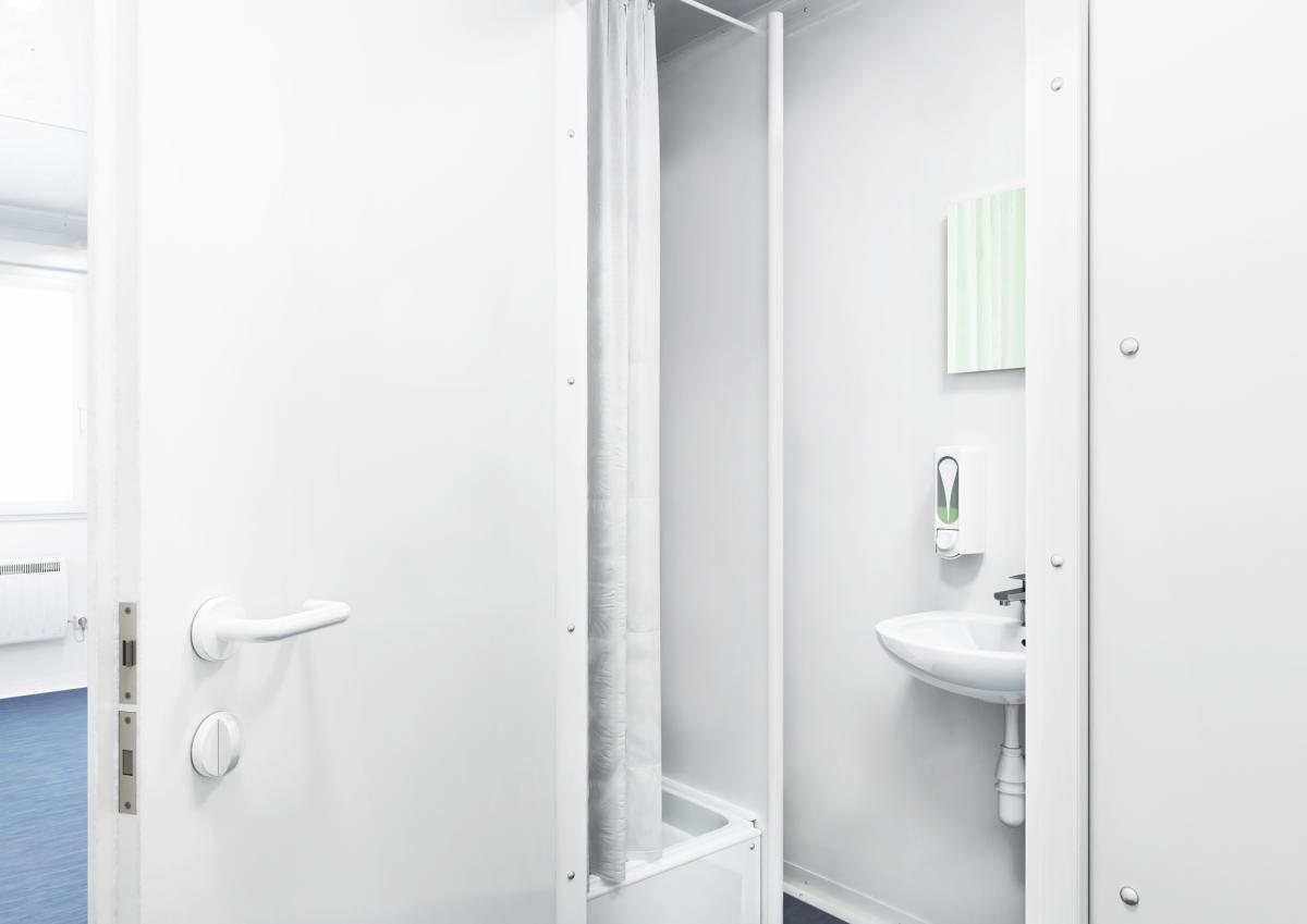 Bei Arbeitsplätzen und Wohnräumen auf Zeit dürfen auch geeignete Sanitärbereiche nicht fehlen. Die Duoanlage verfügt neben einer bildschirmtauglichen Beleuchtung und Mehrfachsteckdosen zusätzlich über einen separaten Sanitärraum mit WC, Dusche und Waschbecken. Die Sanitär-Ausstattung verbindet zeitgemäßes Design von Markenherstellern mit hoher Funktionalität und robusten, wartungsarmen Materialien.