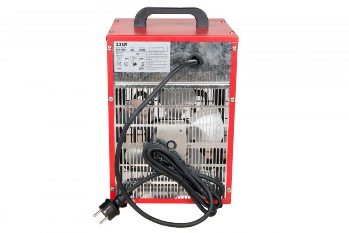 Heizleistung 3,3 kW, 230 V Anschluss, stufenlos einstellbarer Thermostat, Überhitzungsschutz.