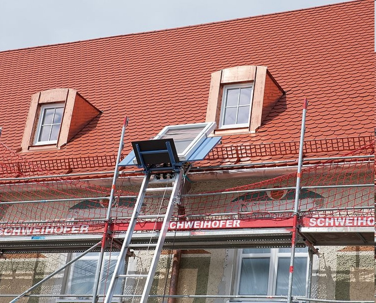 handlich; aus Aluminium; solide Leichtbauweise; kein Leiterteil länger als 2m; aufzustellen wie eine Anlegeleiter; Standardlänge 13 m - ausbaufähig bis 19 m ; Nutzl. bis 250 kg; in wenigen Minuten aufgebaut; Mit dem von 20 bis 45° verstellbaren Knickstück läuft der Aufzug durch ein Fenster in den Raum hinein oder auch auf das Dach. Die nachfolgenden Preise verstehen sich incl. Knickstück und Universalpritsche für eine Hubhöhe bis 13 m.