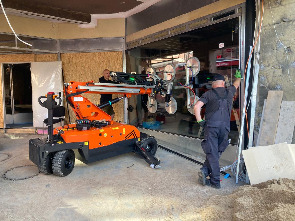 Der MPK10.2 ist nicht nur ein Verglasungsroboter! Mit Haken und einstellbarem Sucher‑Haken ist er ein 990‑kg Pick‑&‑Carry‑Elektrokran mit langlebiger Batterie – ideal für emissions- und geräuschfreies Heben in Innenräumen. Dank seiner kompakten Abmessungen passt er auch durch enge Durchgänge.