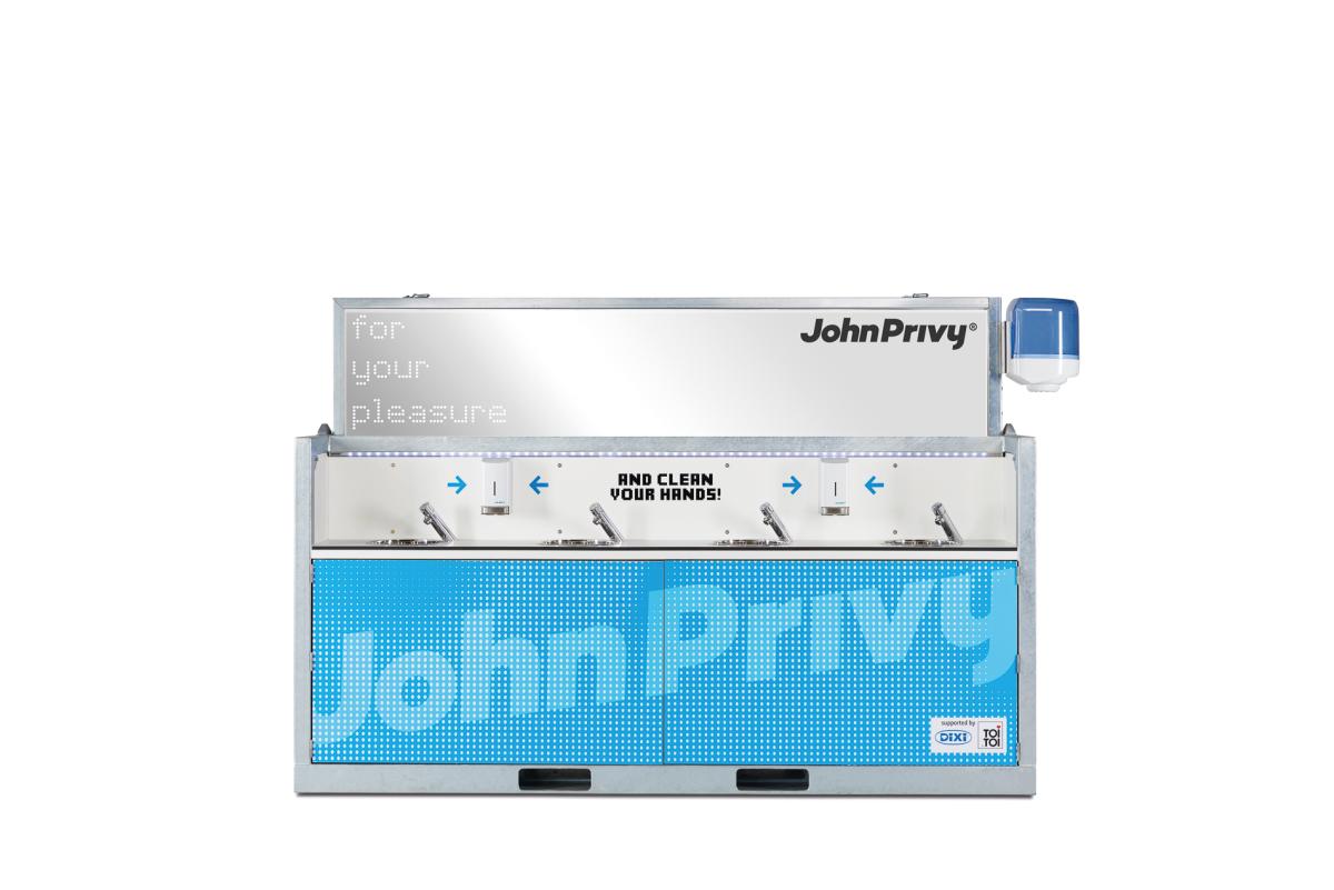 Starker Auftritt: John Privy®, das innovative Vakuum-Sanitärkonzept von TOI TOI & DIXI, punktet mit hohem Komfort, modernster Technik und coolem Veranstaltungs-Design. Unsere Waschbecken-Unit bietet insgesamt 8 Waschbecken mit Vakuumtechnologie. Auch bei hohem Besucherandrang ist so für schnellen "Durchlauf" gesorgt.