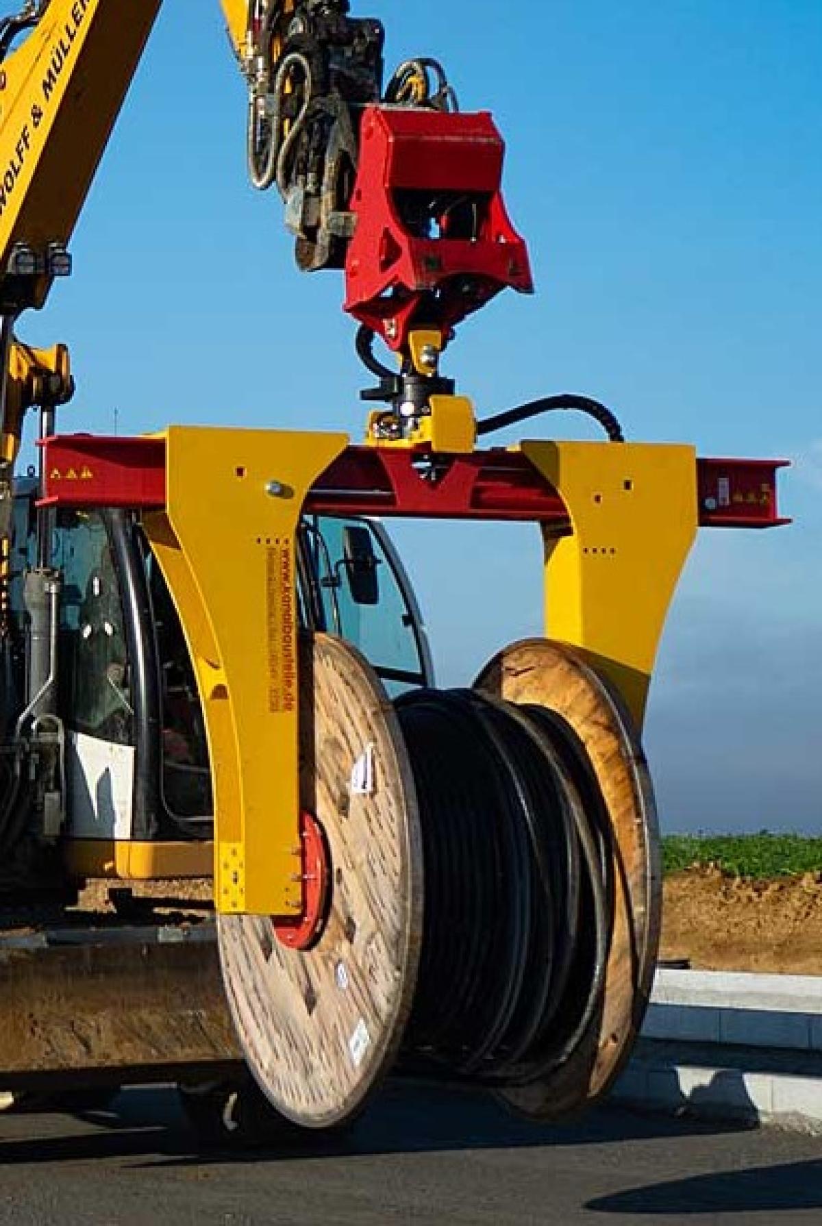 Der KabelFIX nimmt die Trommel mit den beiden beweglichen Armen in die Zange und und versetzt diese mit einem ebenfalls hydraulisch angetrieben Motor in Drehung. Die Drehgeschwindigkeit steuert der Fahrer feinfühlig per Joystick.