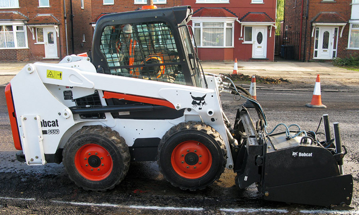 Bobcat Vermietung Kompaklader S 550 mit Schaufel, mögliches Zubehör: Grader, Planierschilde, Mulchcher, Schlägelmäher, Aufreiszahn, Hydraulikhammer, Palettengabeln, Erdbohrgerät, diverse Fräsen (Beton, Asphalt, Baum) und diverse Ladeschaufel