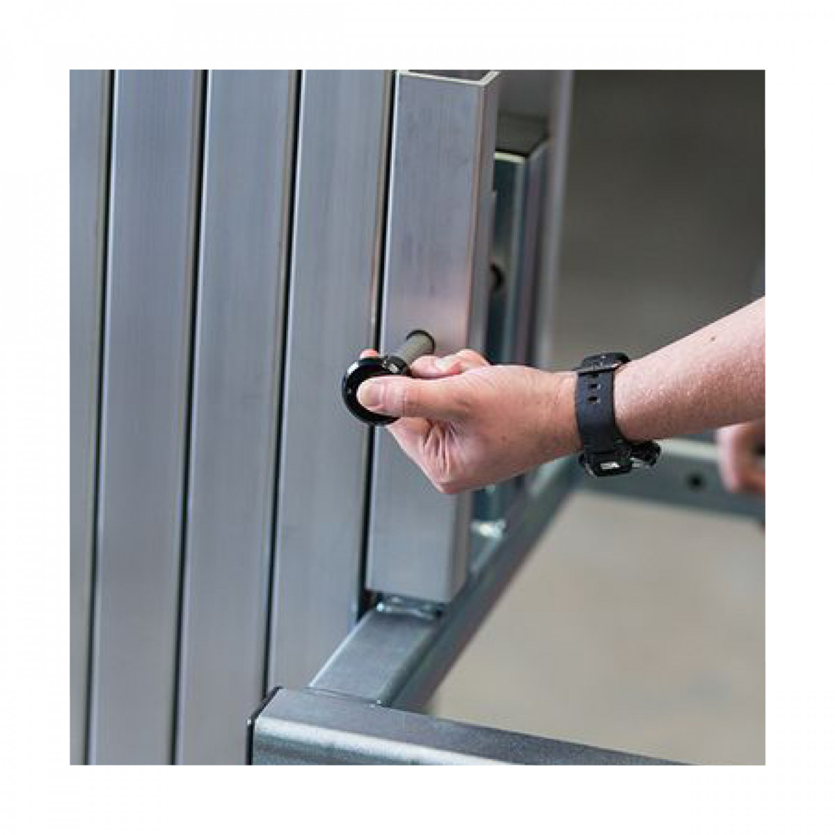 Einfacher werkzeugloser Aufbau durch eine Person dank innovativem Fahrgestell mit Federriegelarretierung