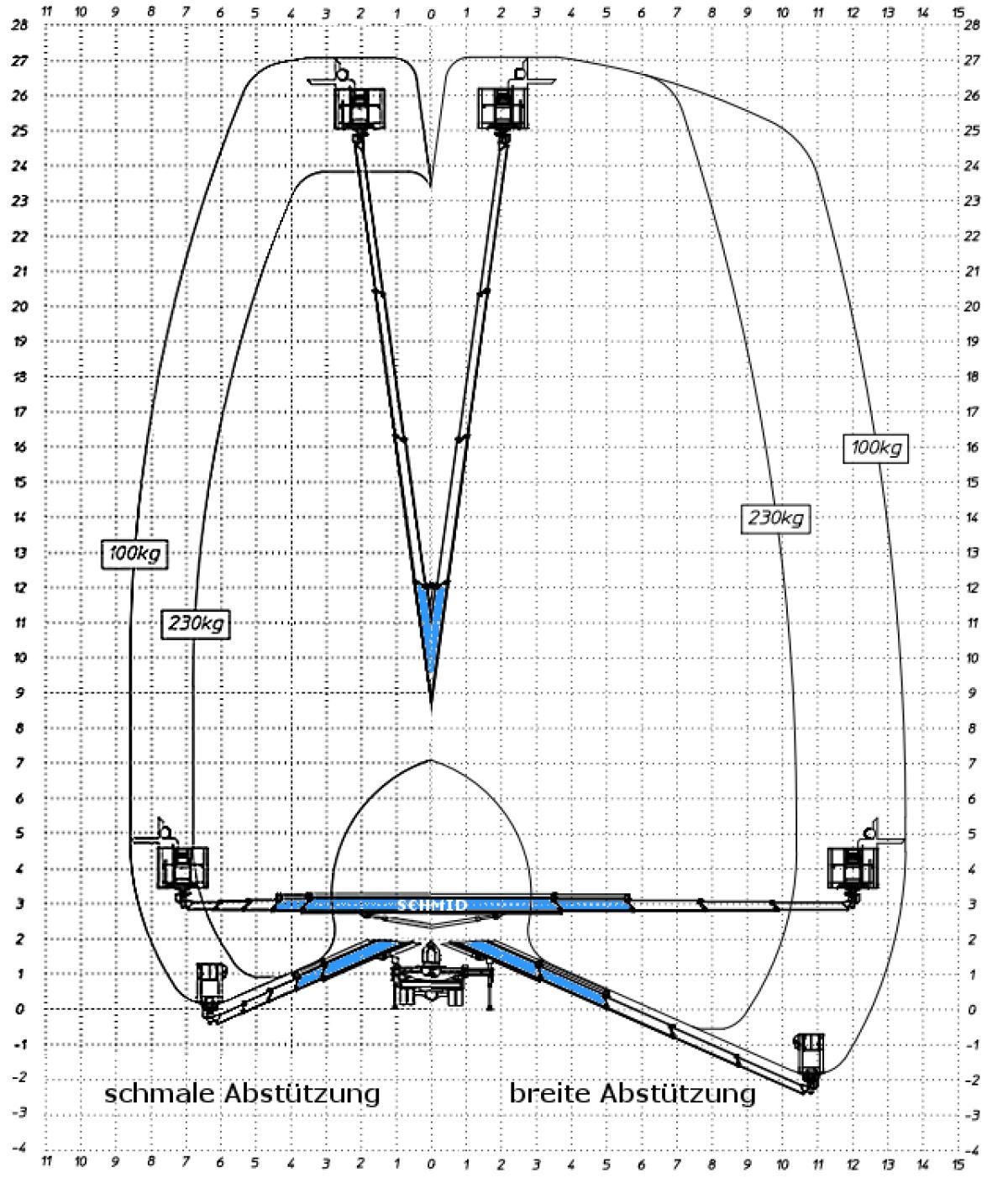 | Arbeitsreichweite seitl. (Arbeitsbühne) | 13.5 Meter |