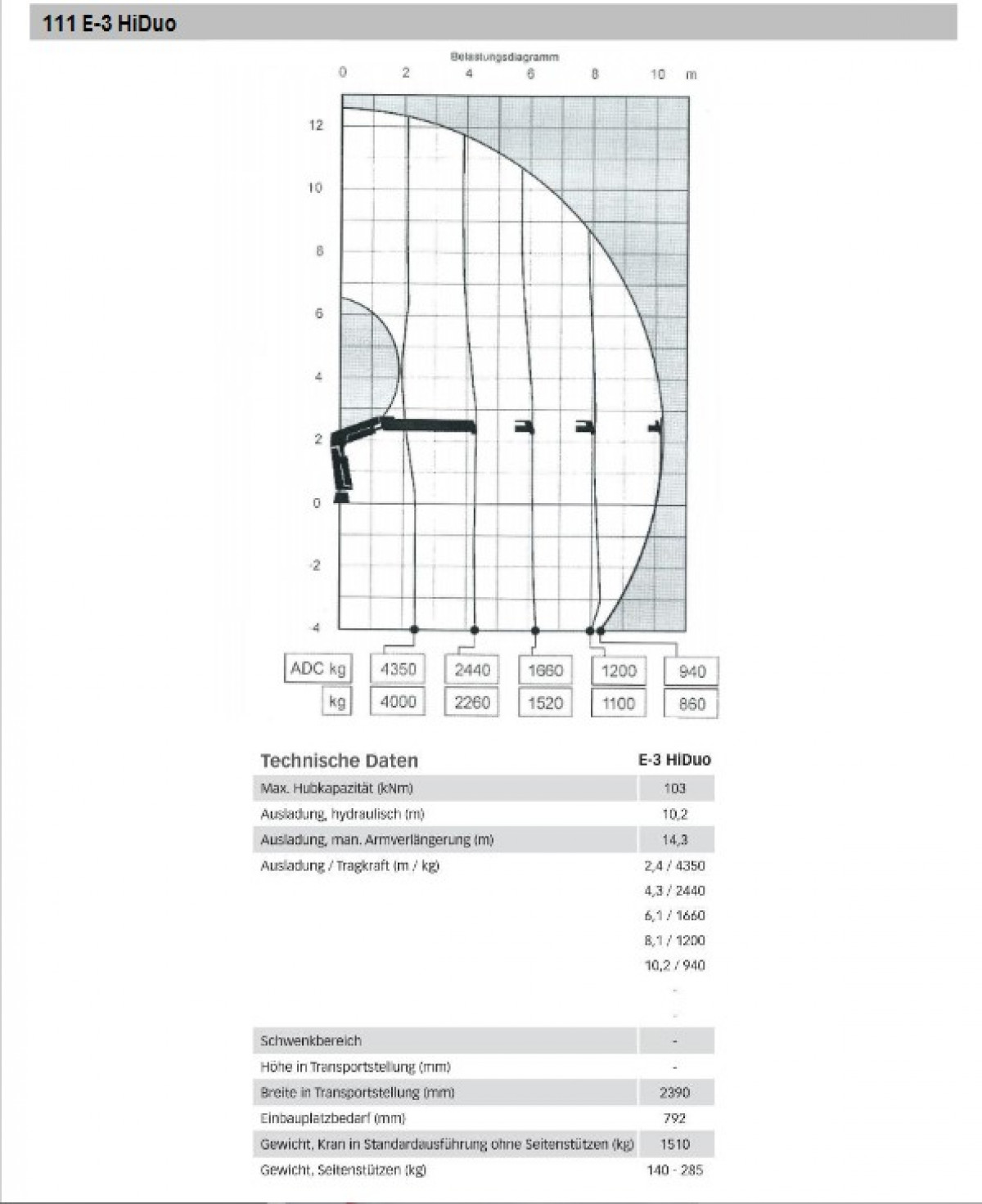 Stückgutkran HIAB XS 111 E-3 Hi Duo Steuerung Funk (Piano) max. Kraft (bei Auslage) 4.350 kg (4,00 m) 940 kg (10,20 m), Maße d. Ladefläche 4.500 x 2.420 x 800 mm, max. Nutzlast 5.420 kg, Besonderheiten Stützen schwenkbar Allrad, Kran absattelbar Platte für Kommunalhydraulik Doppelkniehebelgelenk
