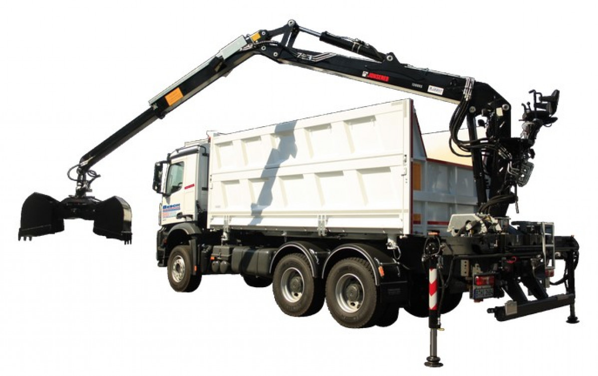 26 t - Kran - V2 Recyclingkran JONSORED J1300 R81, Steuerung Hochsitz (2 Pedale & 2 Kreuzknüppel), max. Kraft (bei Auslage)3.800 kg (3,00 m), 1.520 kg (8,10 m), Maße d. Ladefläche 5.000 x 2.350 x 1.850 mm, max. Nutzlast 9.350 kg, Besonderheiten Einseitenkipper, Schüttgutgreifer, Stützen schwenkbar Bordmatik einseitig