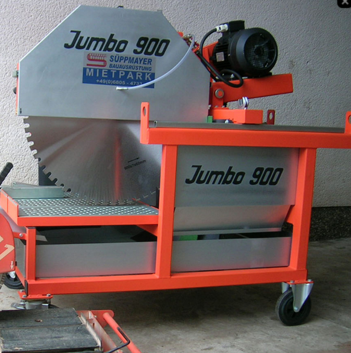 Mauersteinsäge Jumbo 900, Gewicht 360 kg, 400 Volt, Max. Schnitttiefe 370 mm, Max. Schnittlänge 720 mm, Max. Materialhöhe 440 mm, Abmessungen Schneidtisch 720 x 800 mm, Max. Blattdurchmesser x Blattaufnahme Ø 900 x 60mm