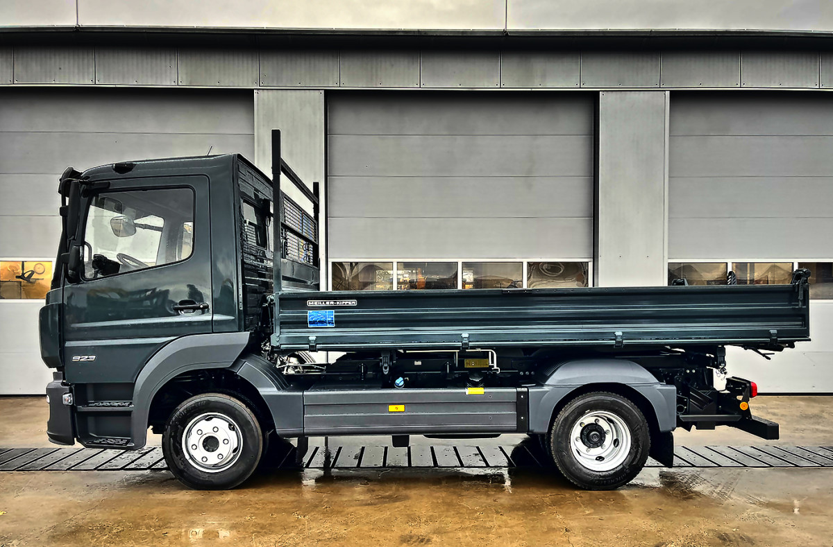 Dreiseitenkipper Mercedes Atego, Gewichtsvariante 9,5 t (3,8/6,2), Ablastung auf 7,5 t ist möglich, Neu Bau Standard, Motor OM934, R4, 5,1 l, 170 kW (231 PS), Euro 6 E, Schaltung manuell, S-Fahrerhaus ClassicSpace, 2,30 m, Klimaanlage, Tempomat, Aufbau Meiller Standard-Dreiseitenkipper, 4000 x 2350 x 400 mm, Hydraulikanschluss für Kipp-Anhänger, Anhängerkupplung G 135