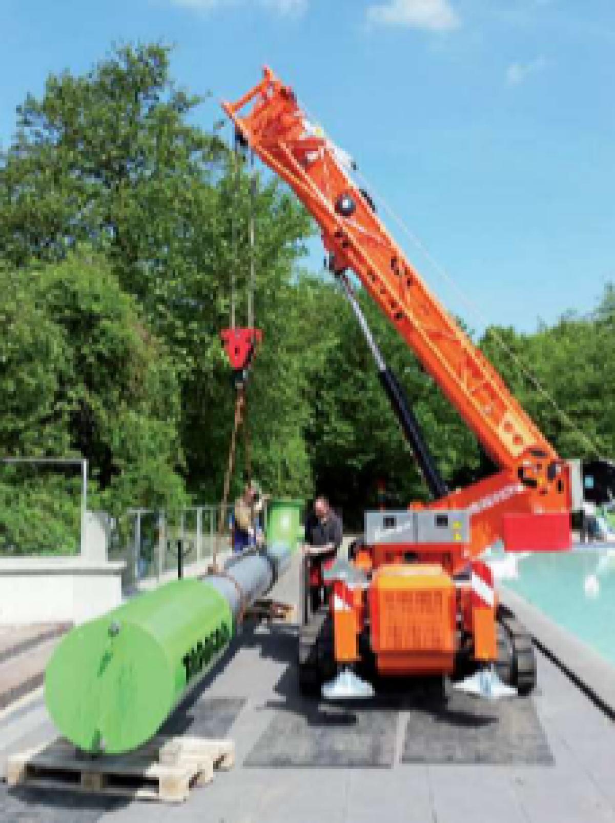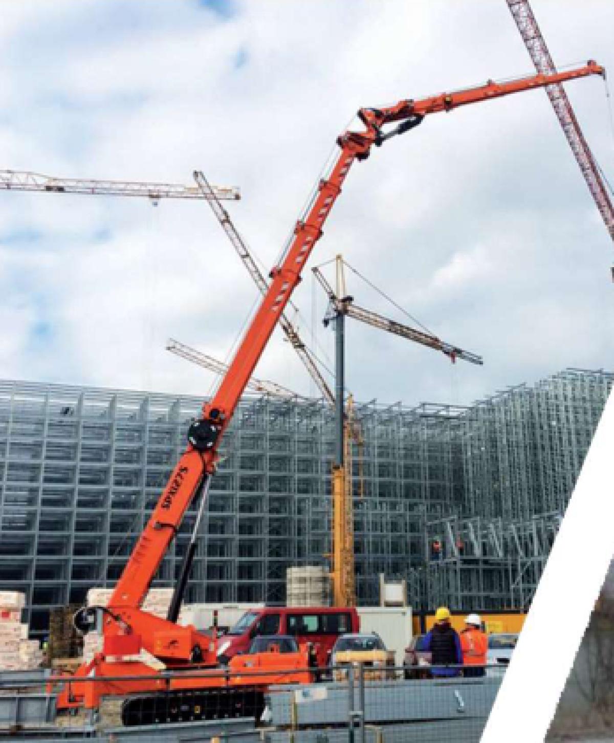 Minikran Jekko SPX 1275 Raupenkran, Gewicht 6800 kg, Tragkraft max. 7500 kg, Arbeitshöhe 27,5 m, Ausladung 17,8 m, Breite 1450 mm.