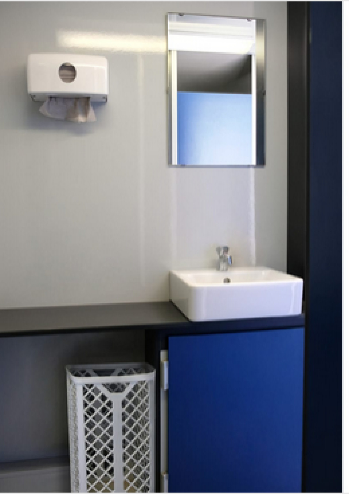 Austattung: 3 Damentoiletten, 1 Herrentoilette, 4 Urinale, Beleuchtung Frostwächter je Abteil eine Dachluke für die Belüftung je Abteil ein Handwaschbecken mit Armatur Erstbestückung mit Toilettenpapier, Papierhandtüchern und Seifenspendern, 25 Meter Wasserschlauch mit einer 3/4" GEKA-Kupplung 5 Meter Abwasserrohre, aufgeteilt in Winkel- und Längsstücke (DN 110)