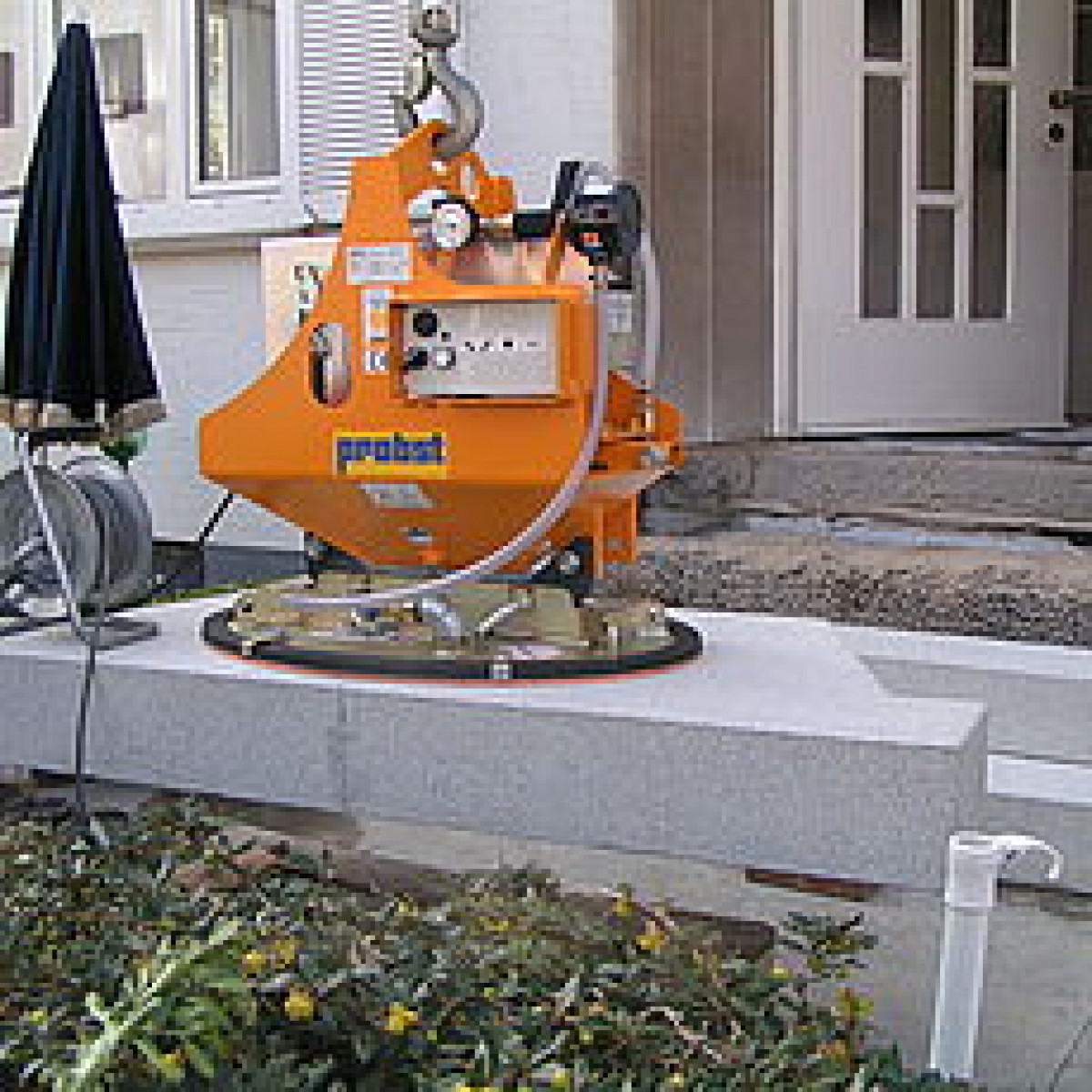 Die Vakuumhebegeräte können mühelos und wirtschaftlich Naturstein-, Beton-, Marmorplatten, Rohre, Trittstufen usw. anheben und versetzen. Die SH-Serie kann mittels Lasthaken, Ketten oder Seil an jedes beliebige Trägergerät angehängt werden. Das VPE12E kann wahlweise mit einem Ein-Mann-Tragegriff oder mit einem Zwei-MannDoppeltragegriff angemietet werden.