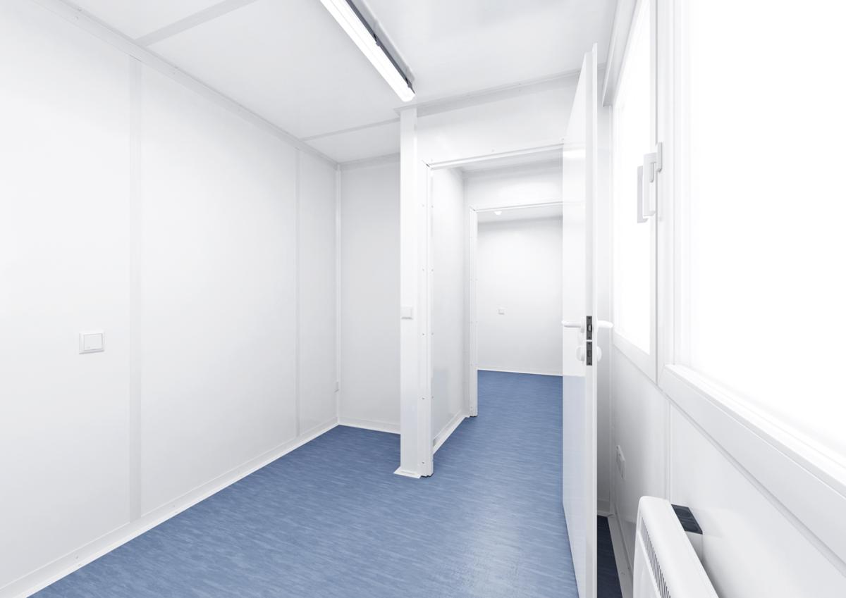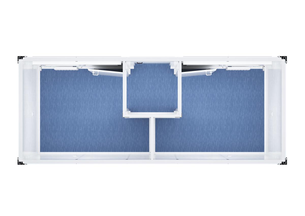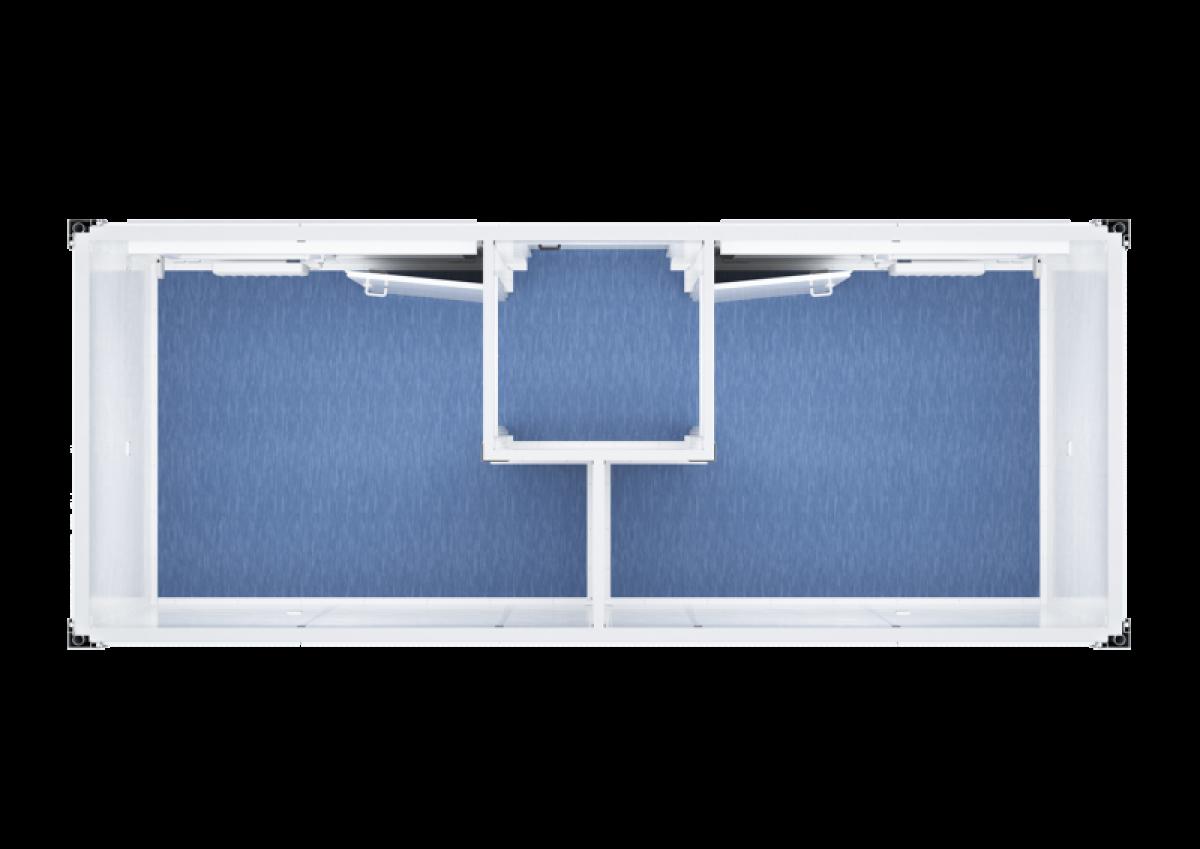 Die Variante mit Raumteiler ermöglicht eine besonders effektive Nutzung des Containers – und lässt viel Spielraum für Ihre Ideen. Durch eine Trennwand entstehen zwei separate Räume. Zusätzlich verfügt das Modell über einen großzügigen Windfang, der Schutz vor Durchzug und kalter Luft bietet. Die weitere Innenausstattung richtet sich ganz nach Ihren Vorstellungen. BAP-Leuchten, Mehrfachsteckdosen und magnetische Wandelemente ermöglichen beispielsweise eine komfortable Nutzung als Büroraum. Durch seine Standard-Bauweise lässt sich der 20-Fuß-Container problemlos in Containeranlagen integrieren.