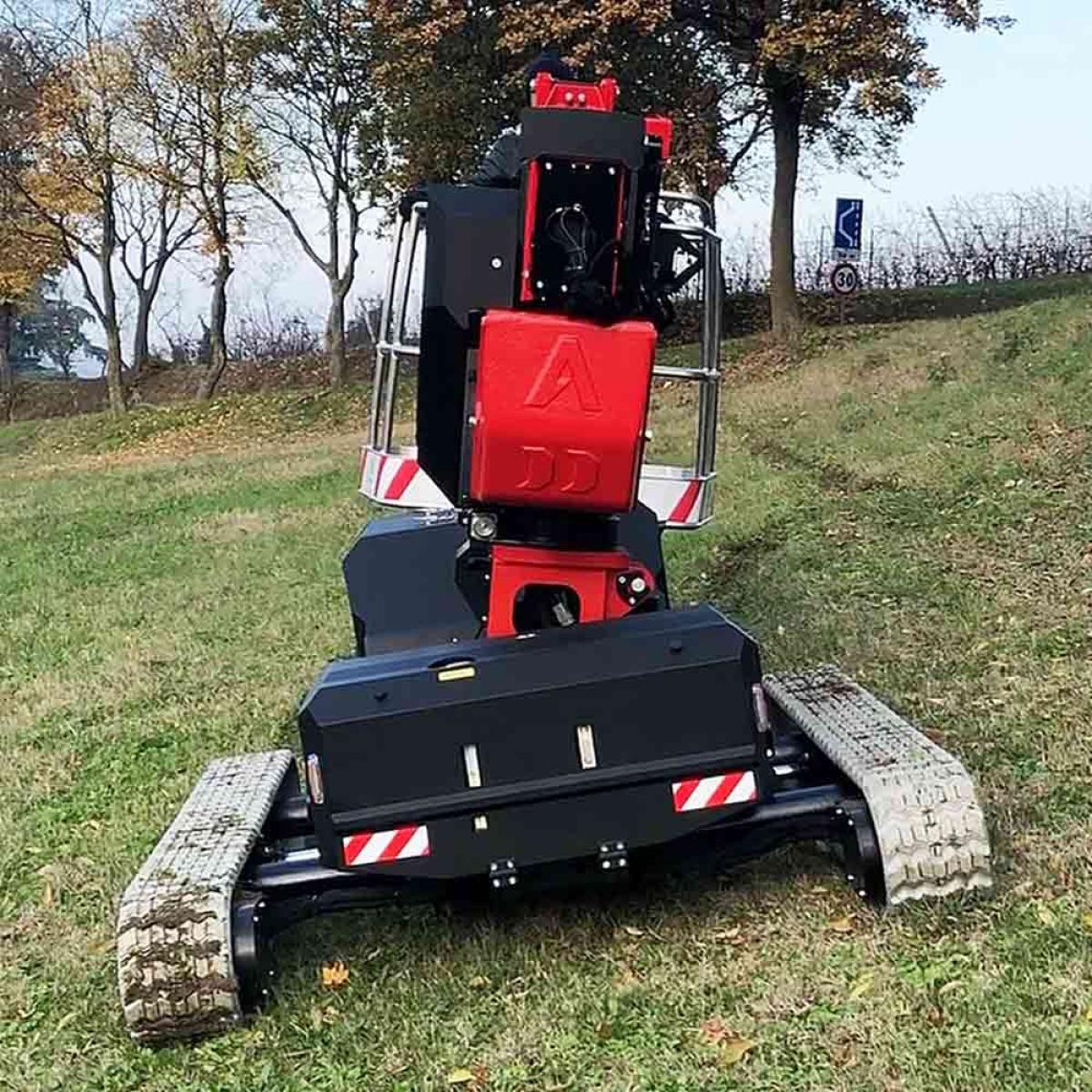 - die Möglichkeit, in unwegsamem Gelände zu arbeiten und Neigungen von bis zu 22° (40%) zu bewältigen. Dies wird ganz im Zeichen der Philosophie von AlmaCrawler durch eine erprobte automatische Nivellierungstechnologie (dynamisch und proaktiv) garantiert, die es ermöglicht sich bis zu einer Höhe von 8 m in vollständig eingefahrener Position auf der Raupe zu bewegen.