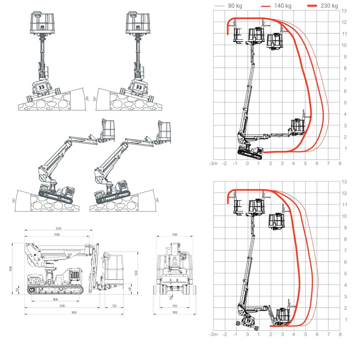 Dank ihrer Ausstattung mit einem leistungsstarken 3-Zylinder-Dieselmotor Yanmar mit 14Kw (19 HP) und einem variablen, einziehbaren (von 1,95 m bis 1,15 m) Raupenfahrwerk ist die JIBBI 1250 EVO eine hochleistungsfähige selbstfahrende Hebebühne. Die Hebebühne verfügt über einen Teleskoparm mit innovativem automatischem Nivellierungssystem, wodurch Arbeitshöhen von bis zu 12.2 m erreicht werden können. Darüber hinaus garantiert dieses Element je nach Betriebsbedingungen und Belastung des Korbs – der für eine maximale Tragfähigkeit von 230 kg und zwei Bediener konzipiert ist – eine seitliche Reichweite von 5,5 bis 7,0 m. Außerdem bietet dieses Gerät folgende Vorteile: