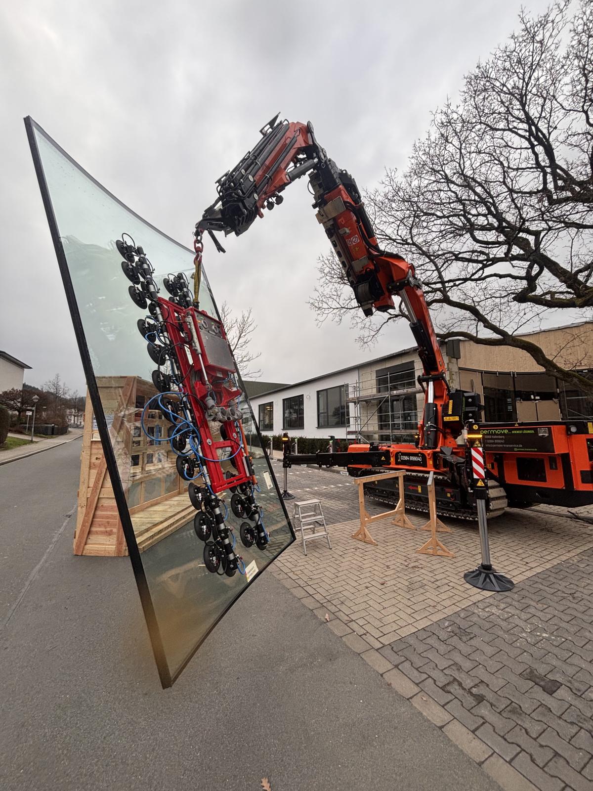 Optionale Anbaugeräte wie eine Schwerlastspitze, ein Glasmanipulator, Vakuumsauger oder Personenkorb für bis zu zwei Personen erweitern die beeindruckenden Möglichkeiten des Knickarm-Raupenkrans.