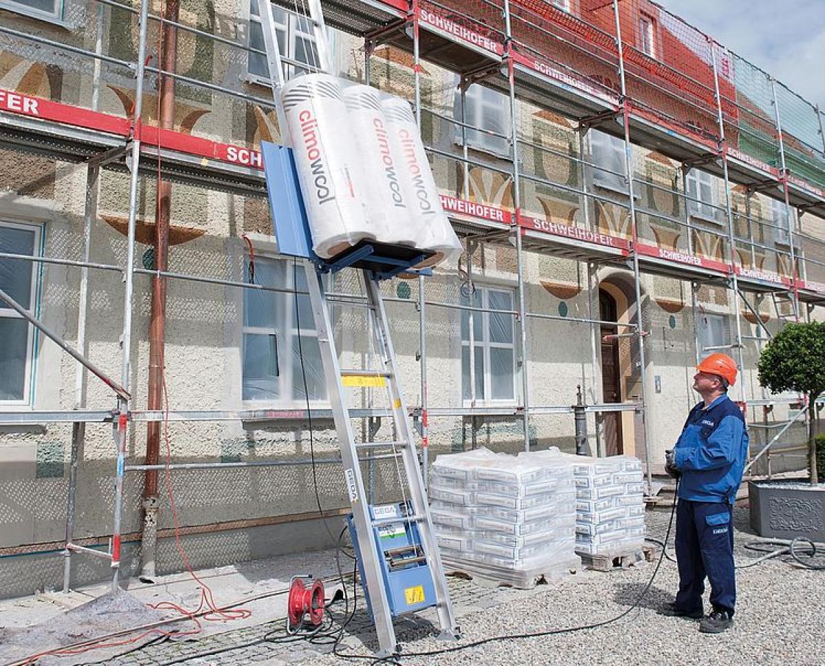 Die Leiternteile können durch massive Gewindeschrauben werkzeuglos am Boden zusammengesetzt werden. Im nächsten Schritt erfolg die Montage des Knickstücks. Ist die Leiter am Gebäude befestigt, kann die kräftige Winde eingehängt werden. Durch die vielseitigen Lastaufnahmemittel ist die Beförderung verschiedenster Materialien möglich.