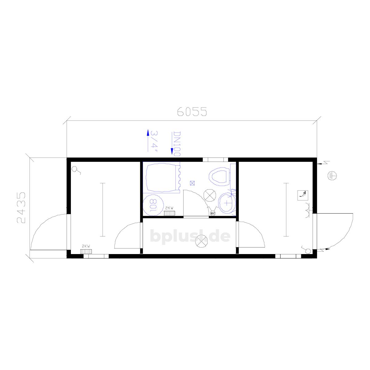 Standardausführung Außenmaße (L/B/H) 6055 mm / 2435 mm / 2800 mm Elektrik nach VDE (400V/32A/5-polig) – Deutsche Norm CEE-Außensteckdosen im Dachrahmen versenkt Innendekor: Stahlblech RAL 9010 2 x Stahlaußentür stirnseitig 3 x Sanitärfenster (Milchglas) mit Kippbeschlag 2 x Lichtbalken 2 x Rundleuchte 1 x Elektroheizung 500 W 2 x Elektroheizung 2 kW 2 x Garderobenleiste 1 x Dusche mit Vorhang 1 x WC komplett 1 x Elektroboiler 80 l 1 x Handwaschbecken 1 x Seifenspender (Verbrauchsartikel können käuflich erworben werden) 1 x Papierhandtuchspender (Verbrauchsartikel können käuflich erworben werden) Sonstige Ausführung gemäß unserer technischen Beschreibung. Deutschlandweite Lieferung – auch für GroßanlagenWir liefern Container aller Art zuverlässig in ganz Deutschland – ob Wohncontainer, Sanitärcontainer, Lagercontainer, Flüchtlingsunterkünfte oder Notunterkünfte. Auch die Anlieferung und Montage von kompletten Großanlagen ist problemlos möglich. Darüber hinaus bieten wir Ihnen die komplette Baustelleneinrichtung – alles aus einer Hand. Sprechen Sie uns einfach an – wir finden die passende Lösung für Ihr Projekt.