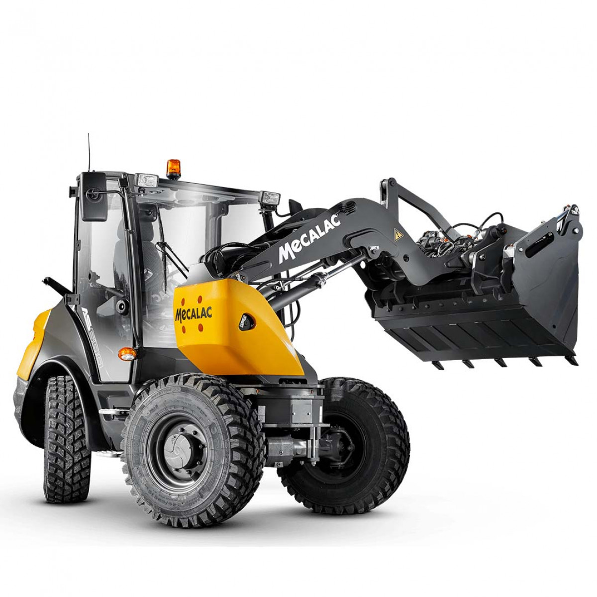 Schwenklader Mecalac AS 600, Gewicht 4400 kg, Schaufelinhalt 0,8 cbm, Arbeitsbreite 1700 mm, Transporthöhe 2490 mm.