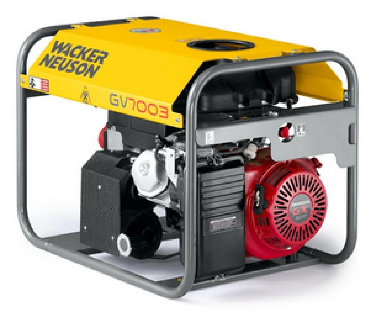Stromerzeuger Generator 7,1 KVA Wacker GV 7003A fahrbar mit Honda-Motor Dauerleistung: 7,1 kVA Kraftstoff: Benzin Gewicht: 81 kg Maße: LxBxH 735x510x520 mm