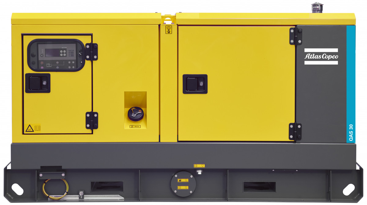 Stromaggregat mieten Atlas Copco QAS30, Leistung 30 kVA, Nennspannung 400 V Schuko 1x230, CEE 16A 1x400 V