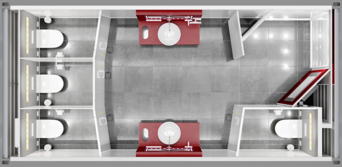 Besonderes Highlight ist der große geneigte Spiegel, der eine Ganzkörperansicht erlaubt und in Kombination mit dem beleuchteten Kosmetikspiegel keine Wünsche offen lässt. Durch raumhohe Wände und Türen sind die Nutzerinnen in den Einzelkabinen perfekt abgeschirmt. Das speziell für die TOI TOI® Superior Line Sanitärcontainer entwickelte sanfte Gold-Light sorgt für eine besondere Atmosphäre. Dezente Hintergrundmusik lässt die Nutzerin das Geschehen um sie herum für einen Moment vergessen.