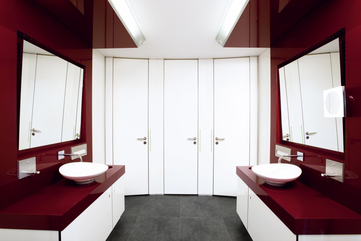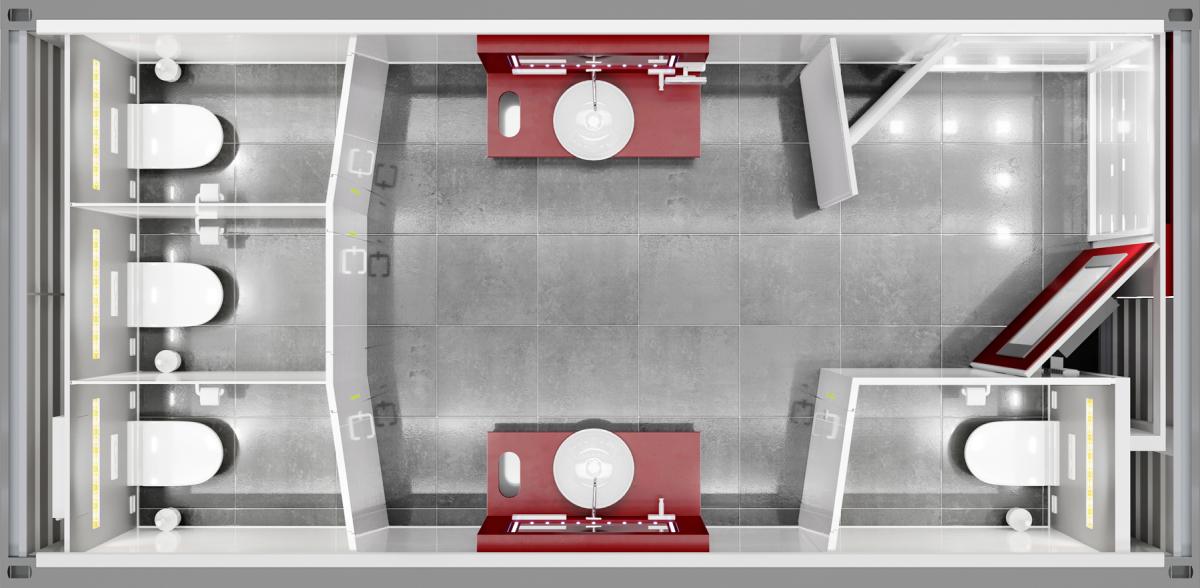 Besonderes Highlight ist der große geneigte Spiegel, der eine Ganzkörperansicht erlaubt und in Kombination mit dem beleuchteten Kosmetikspiegel keine Wünsche offen lässt. Durch raumhohe Wände und Türen sind die Nutzerinnen in den Einzelkabinen perfekt abgeschirmt. Das speziell für die TOI TOI® Superior Line Sanitärcontainer entwickelte sanfte Gold-Light sorgt für eine besondere Atmosphäre. Dezente Hintergrundmusik lässt die Nutzerin das Geschehen um sie herum für einen Moment vergessen.