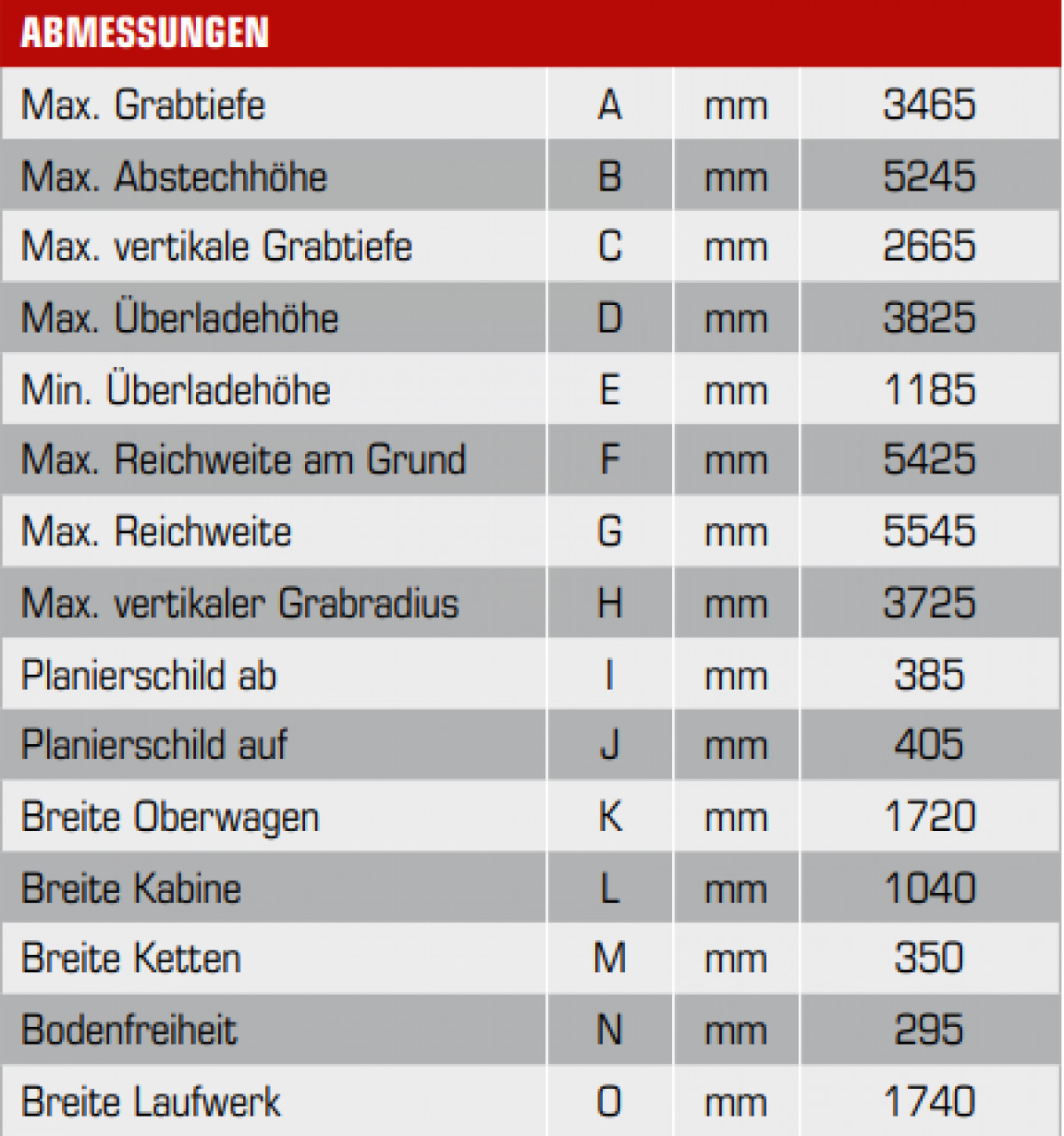 | Technische Daten Betriebsgewicht Motorleistung max. Grabtiefe max. Reichweite max. Schütthöhe Breite über alles Gesamthöhe über Kabine |