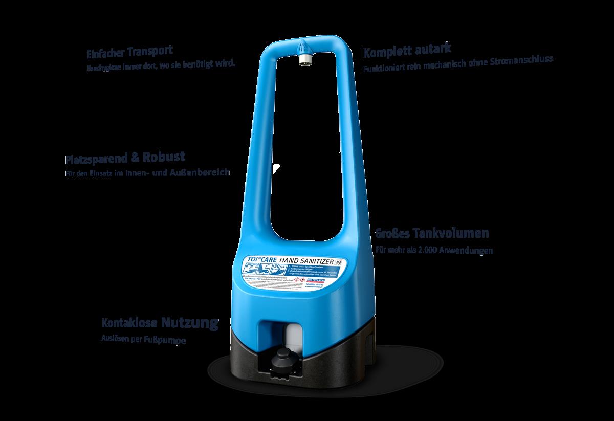 Sie suchen eine praktische, flexibel einsetzbare Lösung für die erhöhten Hygieneanforderungen, die auf Baustellen und an vielen anderen Orten gelten? Mit TOI® CARE HAND SANITIZER sind Sie auf der sicheren Seite. Der mobile Handdesinfektions-Spender wird kontaktlos per Fußpumpe betätigt. Mit seinen kompakten Maßen und seiner robusten Bauweise lässt er sich leicht transportieren und ermöglicht eine schnelle, sichere Handdesinfektion – immer genau da, wo er gebraucht wird.