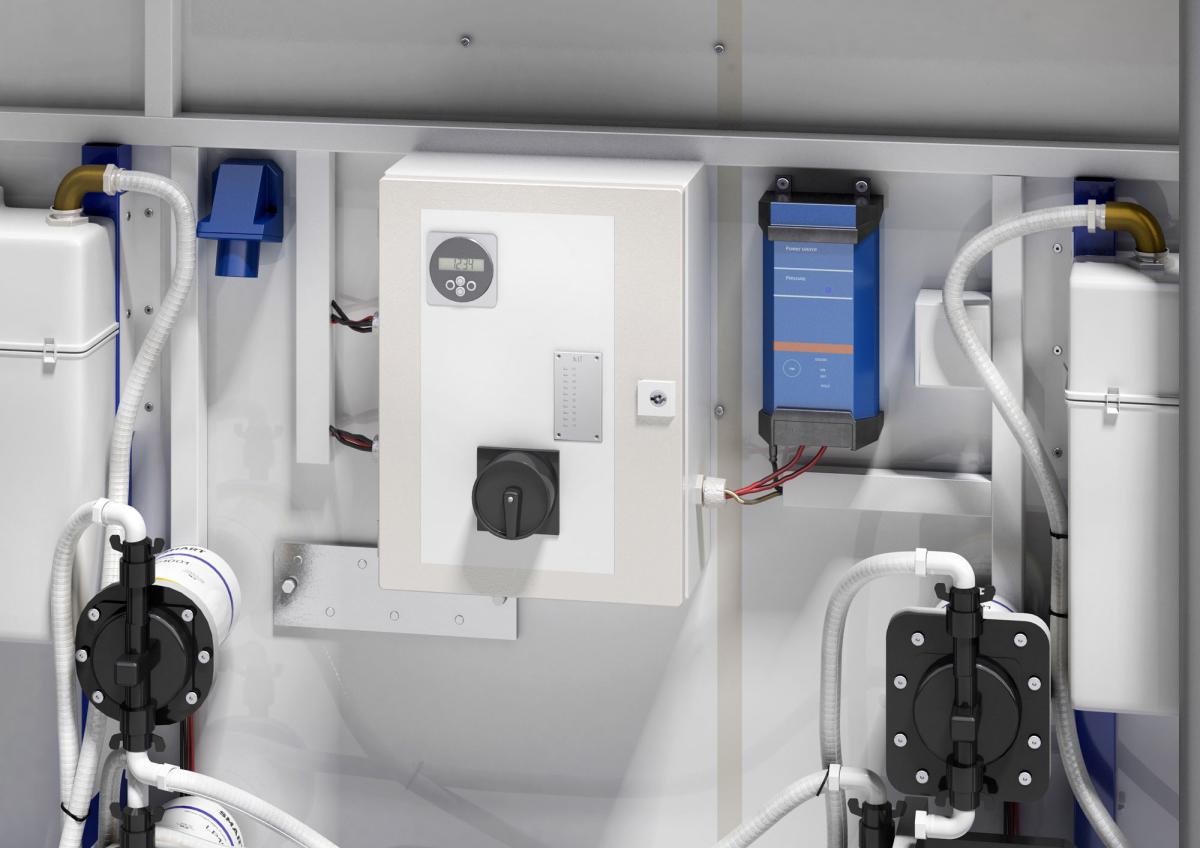 Durch seine integrierten Frisch- und Brauchwassertanks kommt der Toilettenwagen komplett ohne Wasseranschlüsse aus. Zur Spülung der Toiletten wird desinfiziertes Rezirkulationswasser genutzt – der Wasserverbrauch ist minimal. Die Keimfreiheit des Spülwassers wurde von einem Umweltinstitut offiziell bestätigt. Natürlich hat Hygiene hat auch hier oberste Priorität: Für die Handwaschbecken steht ein Frischwassertank mit 125 Liter Fassungsvermögen zur Verfügung