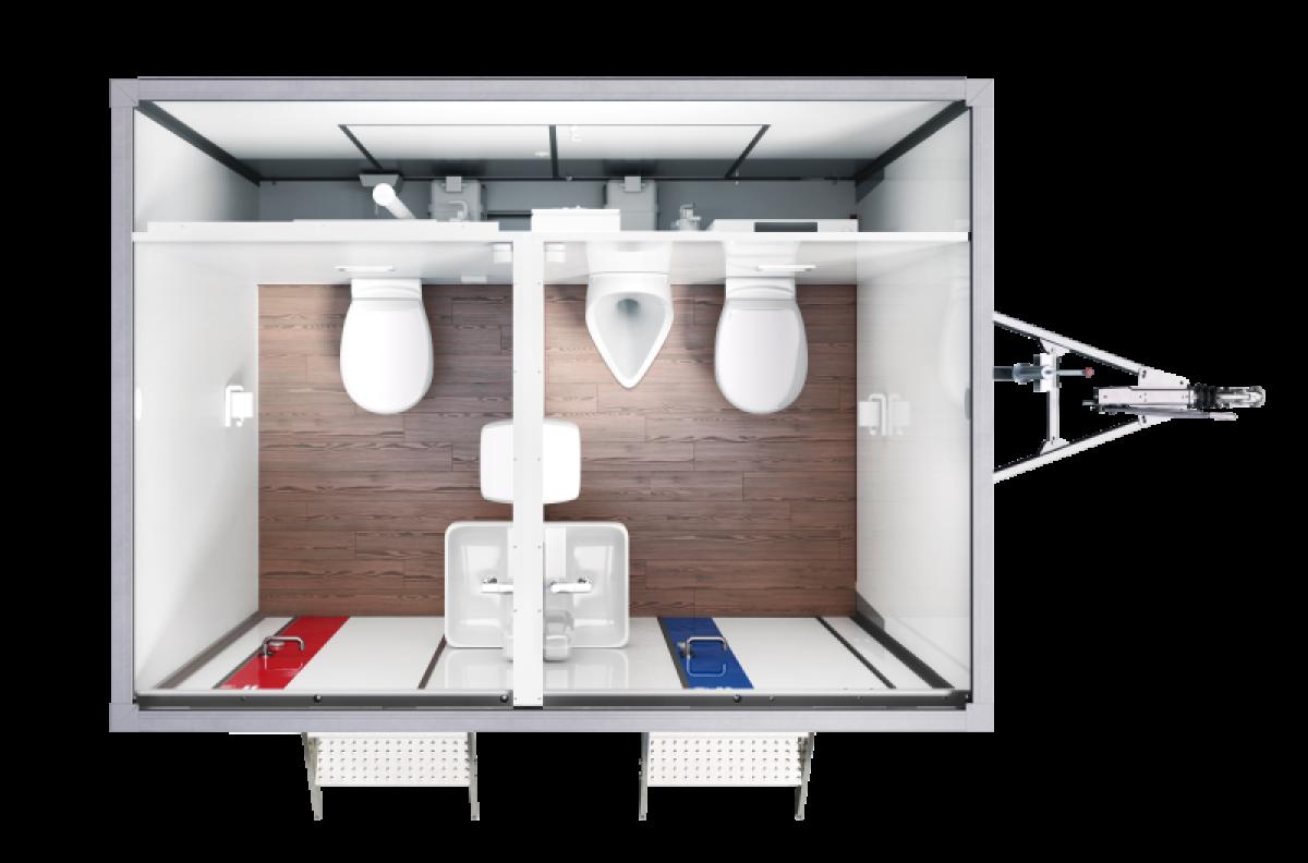 Durch seine integrierten Frisch- und Brauchwassertanks kommt der Toilettenwagen komplett ohne Wasseranschlüsse aus. Zur Spülung der Toiletten wird desinfiziertes Rezirkulationswasser genutzt – der Wasserverbrauch ist minimal. Die Keimfreiheit des Spülwassers wurde von einem Umweltinstitut offiziell bestätigt. Natürlich hat Hygiene hat auch hier oberste Priorität: Für die Handwaschbecken steht ein Frischwassertank mit 125 Liter Fassungsvermögen zur Verfügung