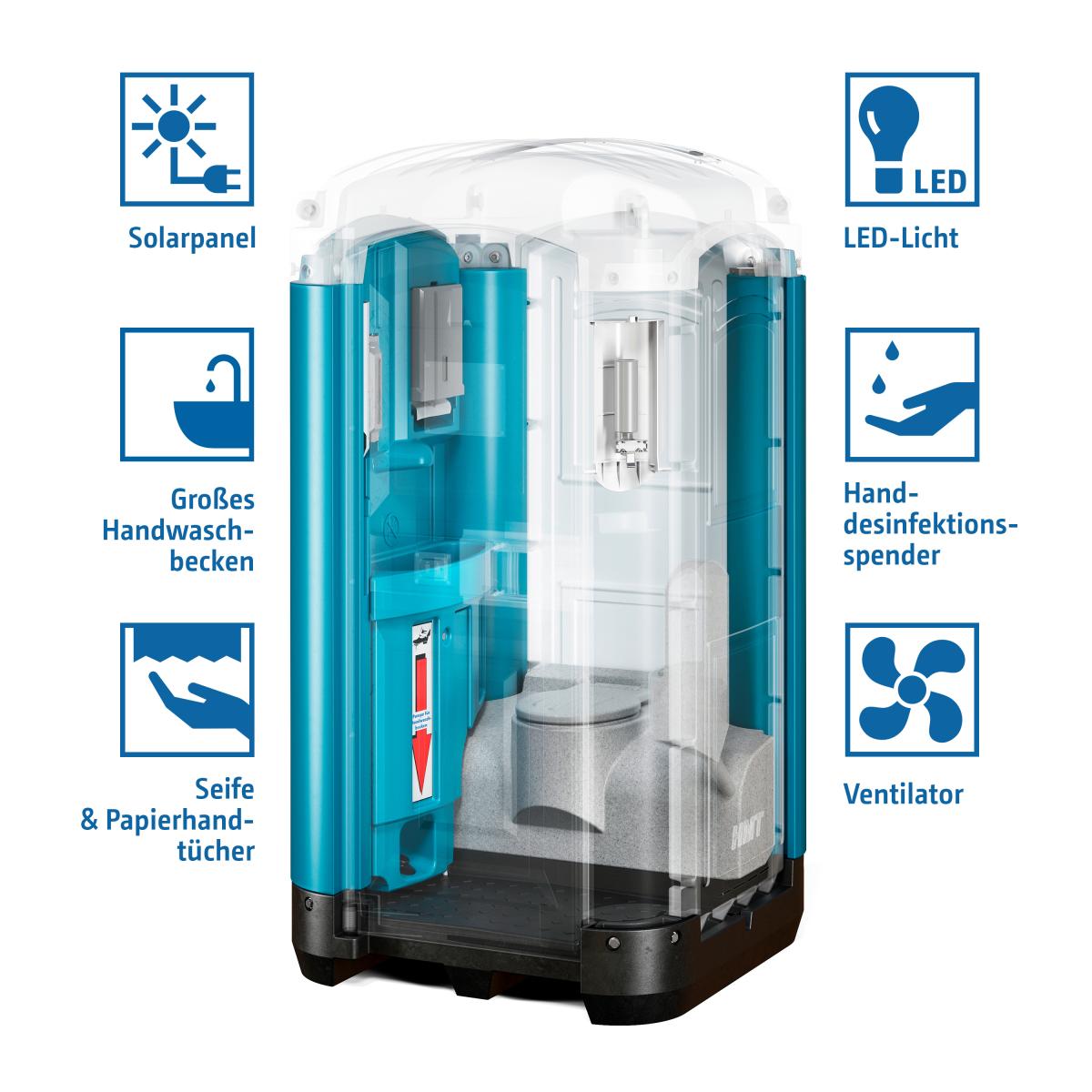 Das Extra an Komfort durch LED-Licht und Ventilator ist optimal in die Seitenwand integriert und wird durch ein Solarpanel mit Strom versorgt. Der Ventilator bringt Frische, entlüftet den geschlossenen Abwassertank und vermindert damit Geruchsbildung. Das Hygiene- und Komfortpaket, eine robuste Verarbeitung, helle Farben und ein ergonomisches, modernes Design machen die TOI® WATER UP zum Must-have und neuen Standard für Baustellen und Events.