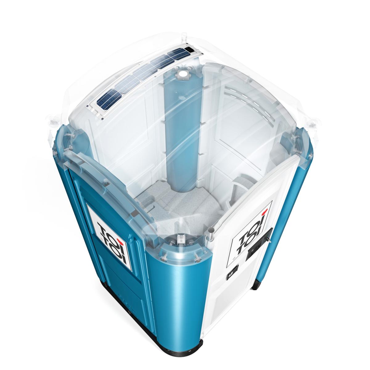 Das Extra an Komfort durch LED-Licht und Ventilator ist optimal in die Seitenwand integriert und wird durch ein Solarpanel mit Strom versorgt. Der Ventilator bringt Frische, entlüftet den geschlossenen Abwassertank und vermindert damit Geruchsbildung. Das Hygiene- und Komfortpaket, eine robuste Verarbeitung, helle Farben und ein ergonomisches, modernes Design machen die TOI® WATER UP zum Must-have und neuen Standard für Baustellen und Events.