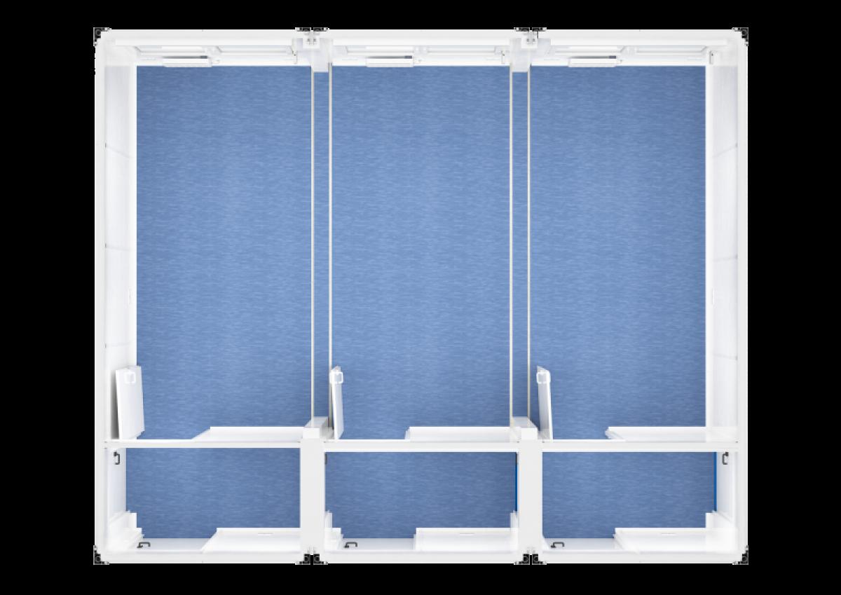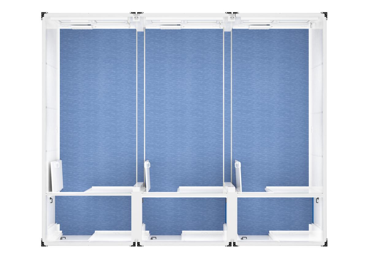 Die Trioanlage überzeugt nicht nur durch ihr umfangreiches Raumangebot, sondern auch durch hohe Funktionalität. Bildschirmtaugliche Beleuchtung und abwaschbare magnetische Wände erlauben eine vielseitige Nutzung. Gerade auf Baustellen und Events bewährt sich zudem der integrierte Flur. Hier können verunreinigte Jacken, Hosen und Schuhe deponiert werden. So gelangt der Schmutz von draußen nicht in die Arbeits- und Wohnbereiche.