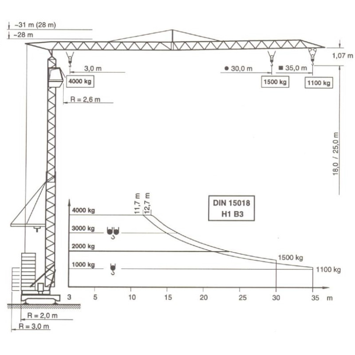 Turmdrehkran Peiner SMK 206, Ausladung max. 35 m, Tragkraft 4000 kg innen, Spitzenlast 1100 kg.