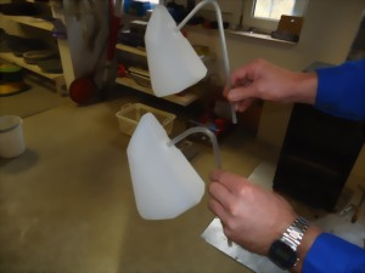 mit Hilfe der Schwerkraft in des Mauerwerk eindringen lassen, die Flüssigkeit mit der die Horizontalsperre aufgebaut wird, läuft per Schwerkraft über ein 8mm-Kunststoffrohr vom Vorratsbehälter zur Mauerwerksbohrung